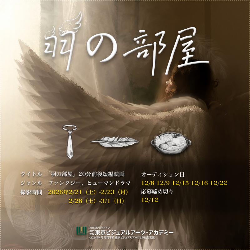 【急募】短編映画『羽の部屋』男性主演2名(東京ビジュアルアーツ·アカデミー学生制作/12月12日締切)