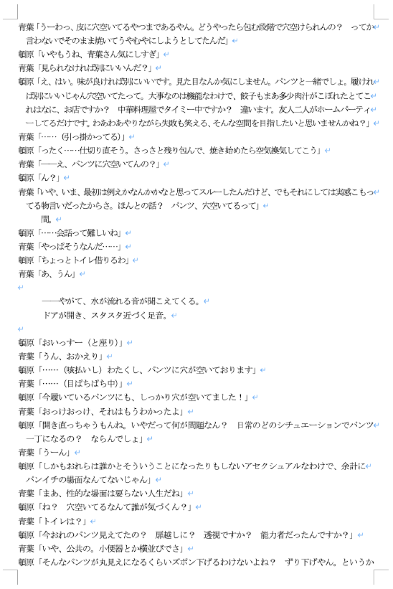 …同じくアセクシュアルの友人男性二人はホームパーティーをするような仲だが、それは今日この日までだったのかもしれない。頓原(29)は日常で他人に下着を見られるシチュエーションがないのでパンツに穴が空いても気にしない派。かたや、青葉(32)は下着は自分の気分を上げるため常に美品を履いていたい派。餃子を包んでいた中でふっと頓原のパンツに穴が空いていることが判明し、そこからパンツを巡る2人の価値観の差異が広がっていく。