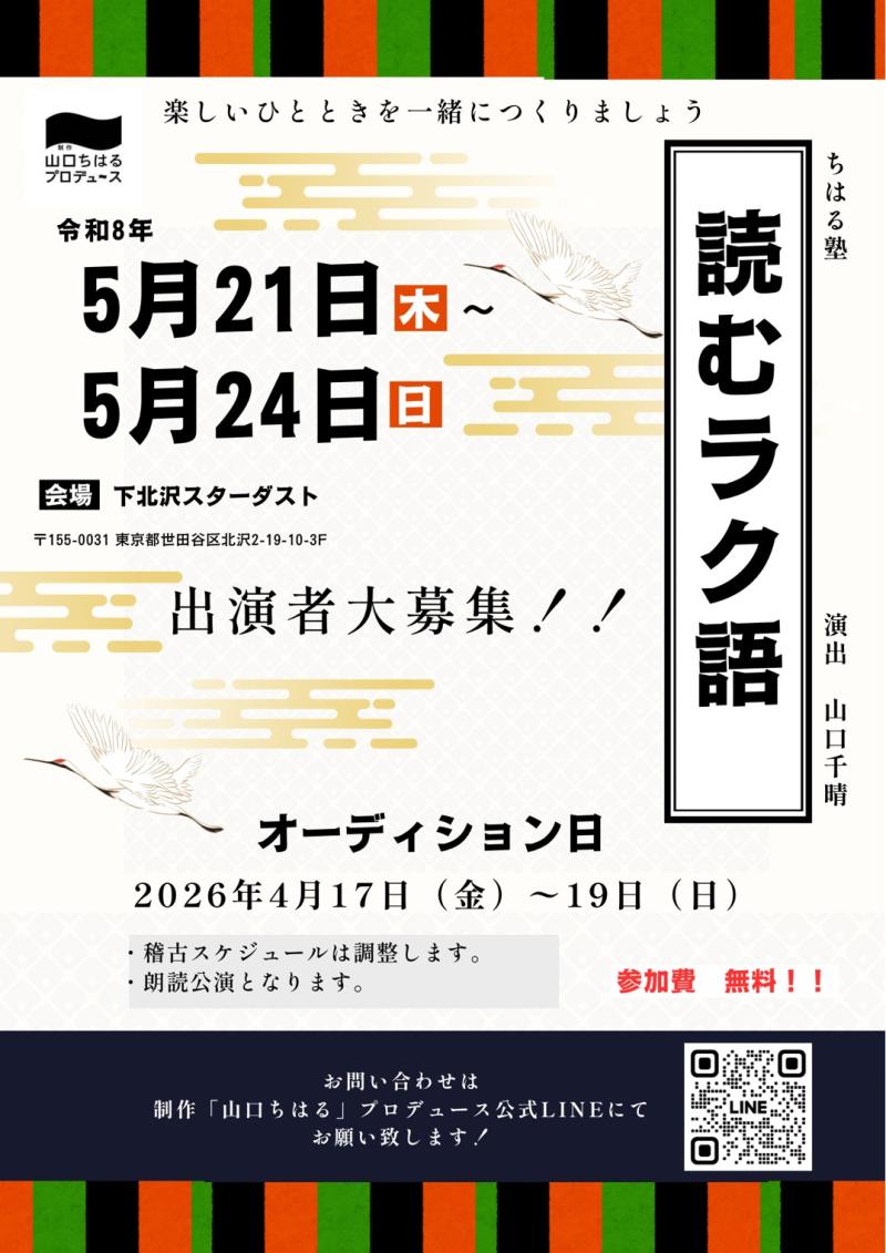 【2026年5月イベント公演!出演者大募集!】 制作「山口ちはる」プロデュース〜ちはる塾〜『読むラク語』出演者オーディション【4月17日・18日・19日】開催!! オーディション締切:4月16日(木)23:59まで
