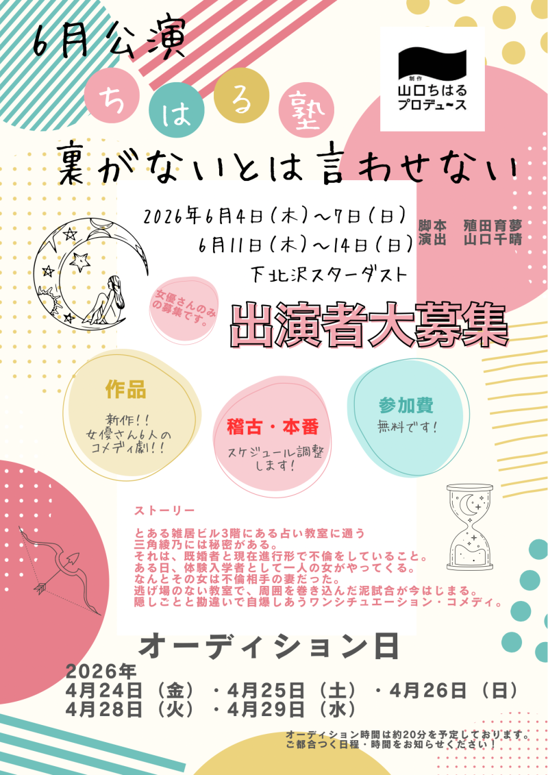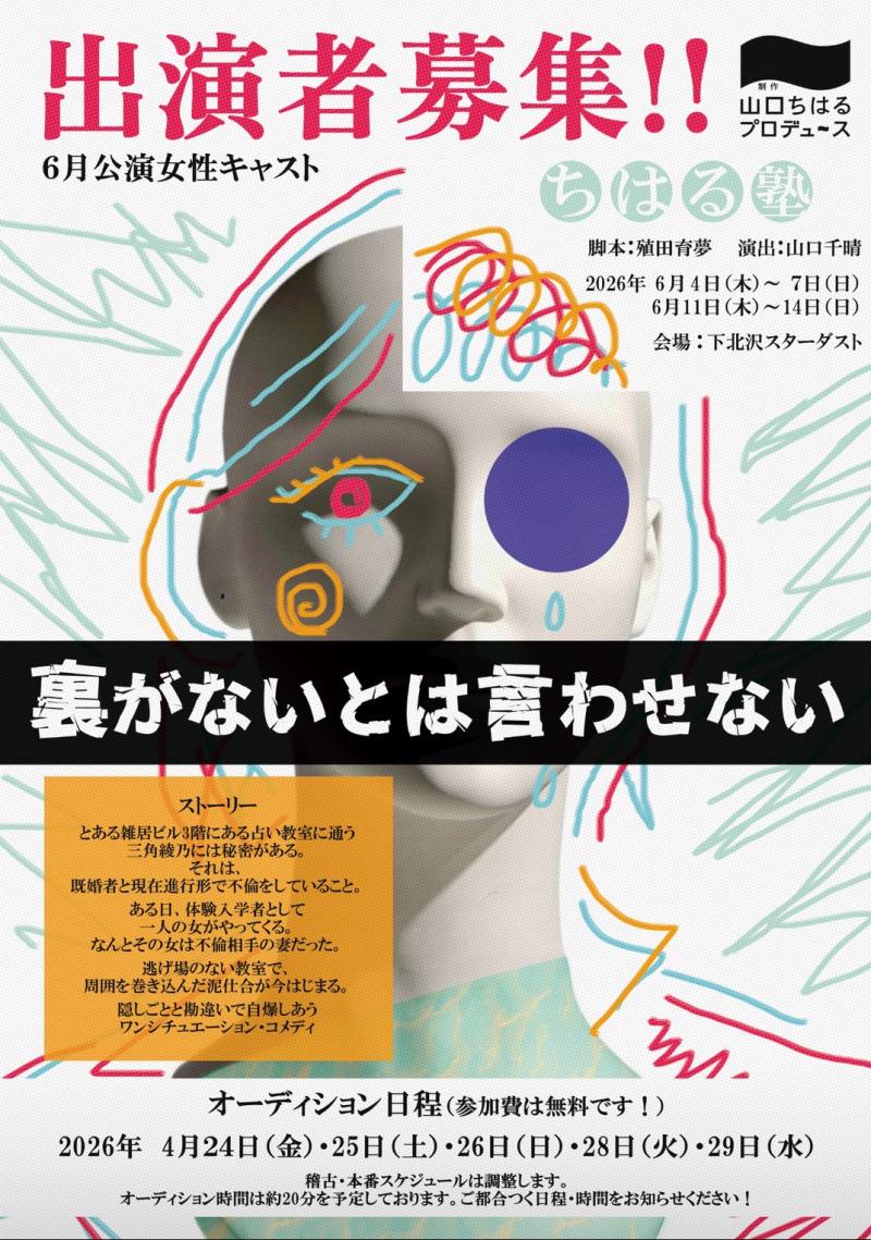 【2026年6月公演!女性キャスト大募集!】 制作「山口ちはる」プロデュース〜ちはる塾〜新作公演『裏がないとは言わせない』出演者オーディション【4月24日・25日・26日・28日・29日】開催!! オーディション締切:オーディション開催日の前日21時まで。