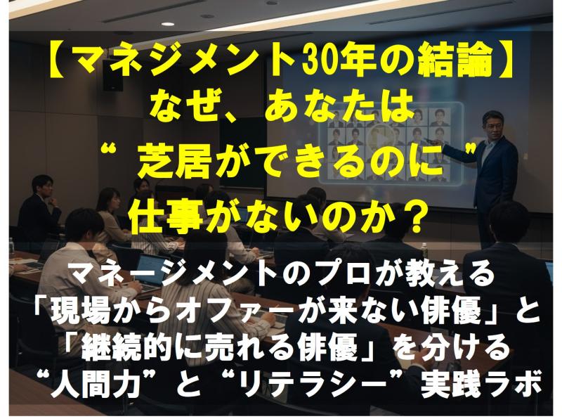 【マネージメント30年が語る】なぜ、あなたは "芝居ができるのに" 仕事が続かないのか? 無名から全国区になった個性派バイプレーヤー、ハリウッド作品出演俳優、ベテラン実力派俳優を支えたマネージメントが「現場からオファーが来ない俳優」と「継続的に売れる俳優」を分ける “ヒューマンスキル(人間力)”と“リテラシー(知識と活用能力)”を学ぶ実践セミナーを開催します。