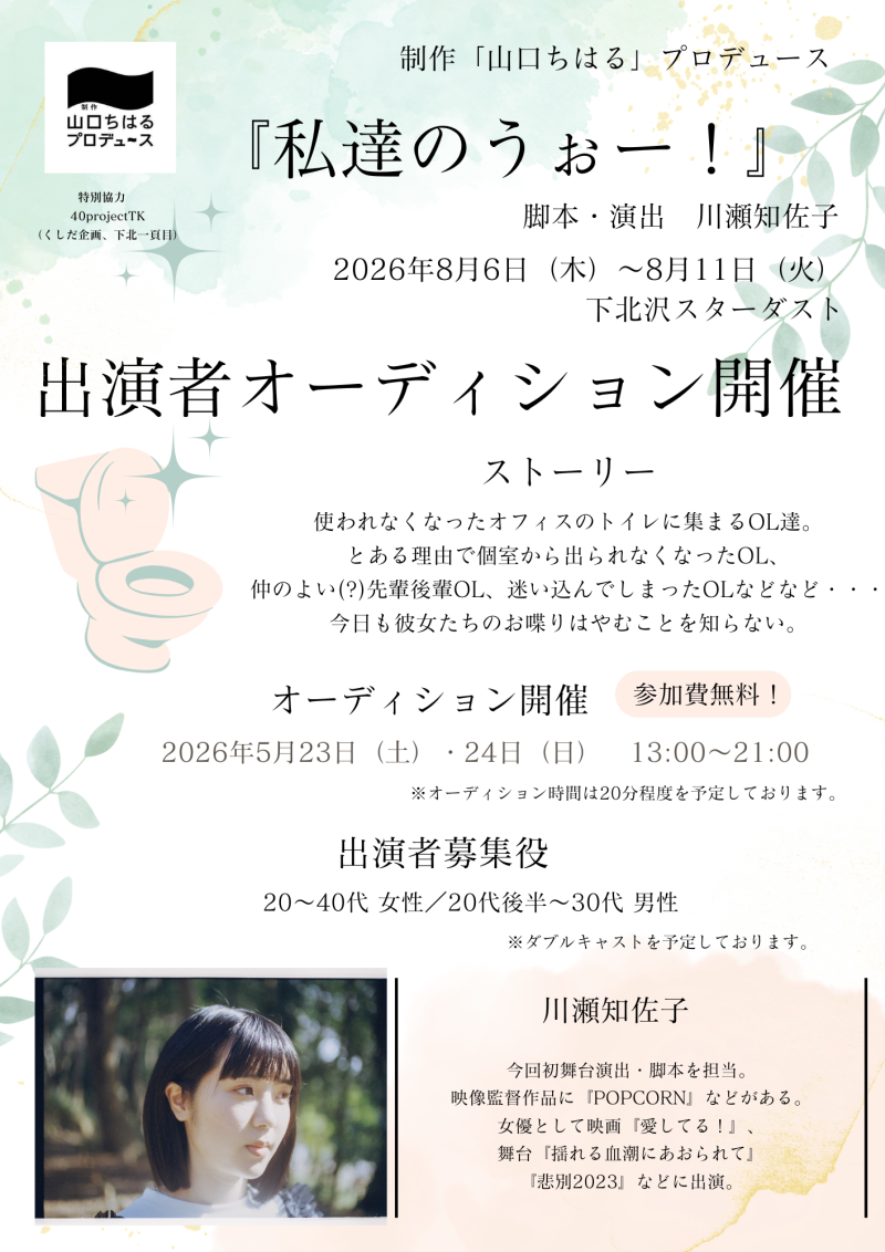 【2026年8月公演】制作「山口ちはる」プロデュース「私達のうぉー!」 脚本/演出:川瀬知佐子 応募締切:2026年5月22日(金)18時まで】