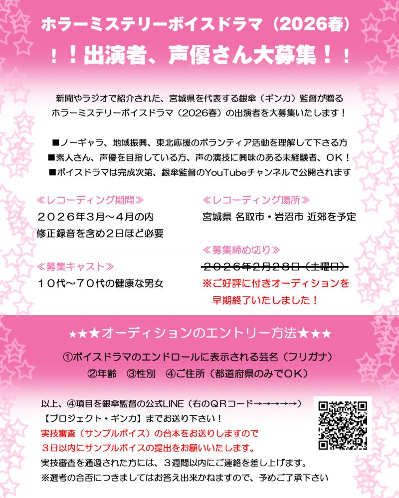 新聞やラジオで紹介された、宮城県を代表する銀傘(ギンカ)監督の【プロジェクト・ギンカ】が贈る、ホラーミステリーボイスドラマの出演者キャストを大募集いたします!