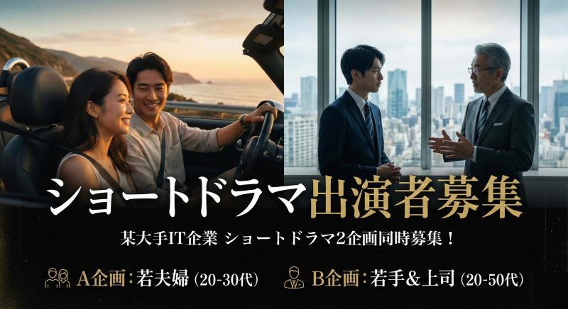 【2案件同時募集】某大手IT企業「ショートドラマ(2篇)」出演キャスト募集/20~30代女性&20〜50代男性/2月下旬撮影