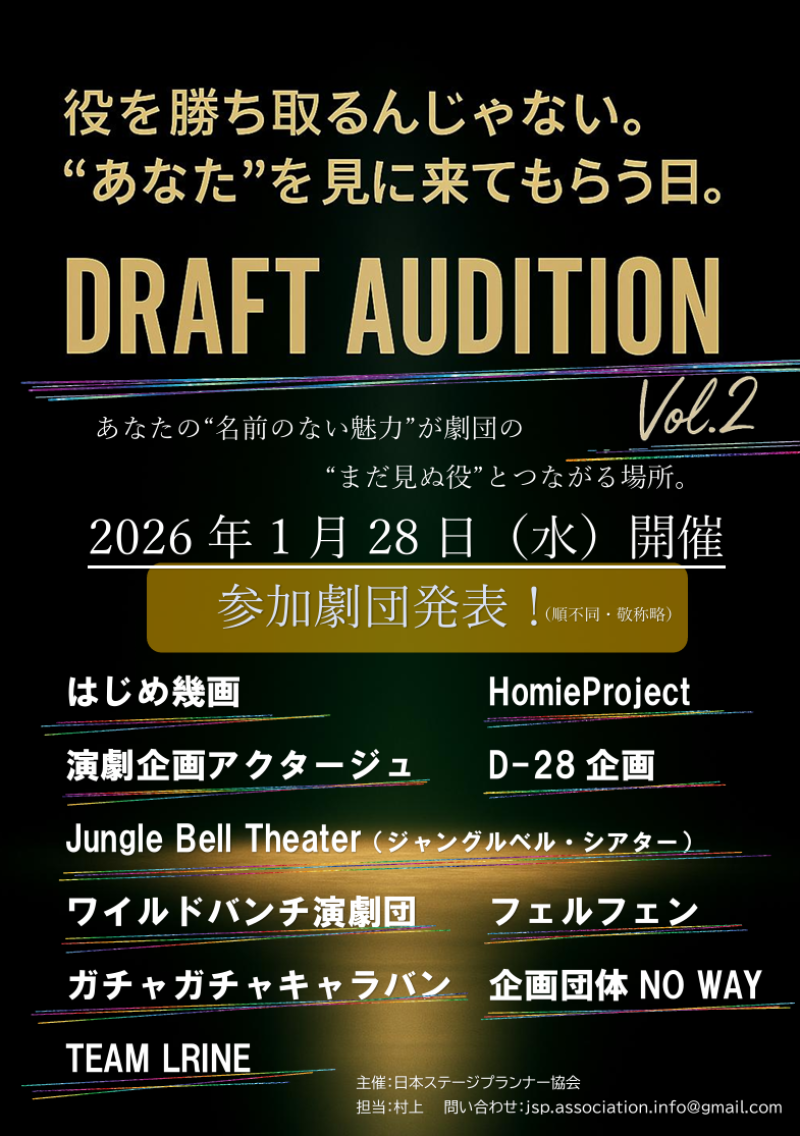 【役者様参加受付中!】13劇団が一挙に集結!ドラフトオーデションVol.2!(一次受付12月末まで。)※好評につき劇団様の参加受付は終了しております。