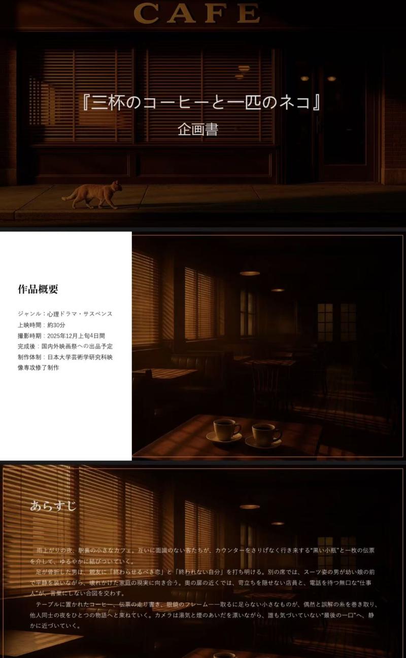 このたび、日本大学芸術学映像研究科の修了制作として、自主短編映画『三杯のコーヒーと一匹のネコ(仮)』で追加キャストとして 武(27〜33)/縁(6〜8) の二役を募集いたします。