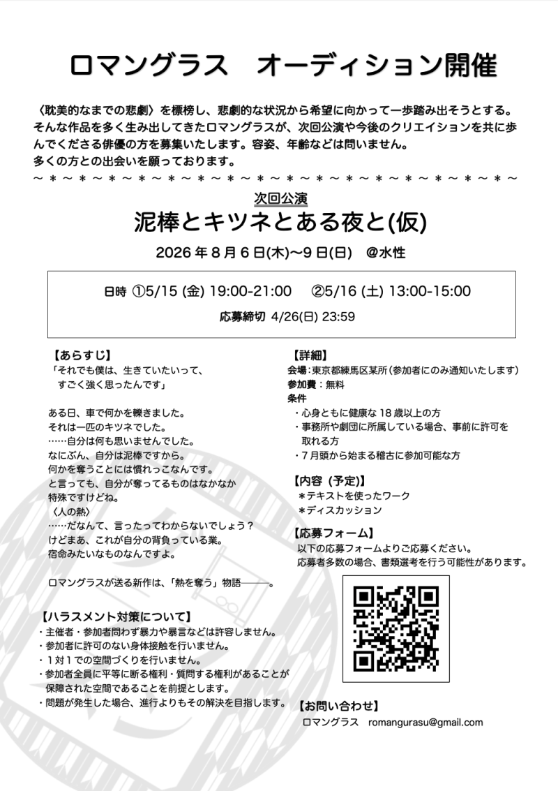そんな作品を多く生み出してきたロマングラスが、次回公演や今後のクリエイションを共に歩んでくださる俳優の方を募集いたします。容姿、年齢などは問いません。