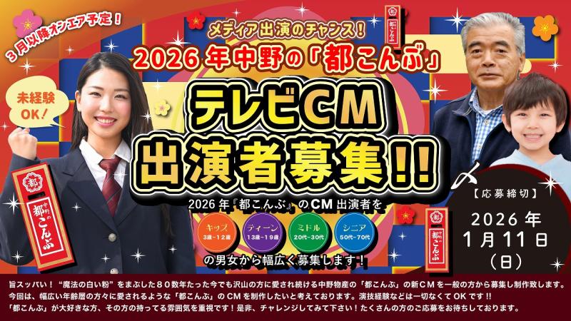 中野の「都こんぶ」2026年テレビCM出演者募集!
