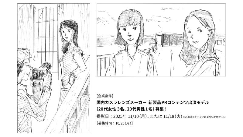 国内カメラレンズメーカー 新製品PRコンテンツ出演モデル(20代女性 3名、20代男性1名)募集! 撮影日:2025年11月10日(月)、11/18(火)※ご出演コンテンツによりいずれか1日 [募集締切:10月20日(月)]