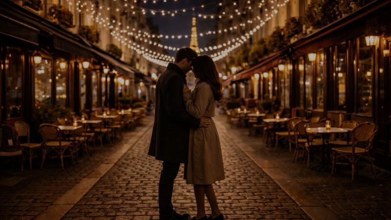 街灯とストリングスライトに照らされた2人