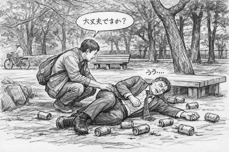 東京で働く不動産会社の新人・林は、営業の壁や文化の違いに向き合いながら日々を過ごしている。語学学校の事務員、上司の大宮とのやり取りの中で、母親の控えめな気遣いに複雑な思いを抱く。ある日、公園で倒れたスーツ男を助けた出来事をきっかけに、人の背後にある責任や思いに気づいていく。夜、歩道橋の上で、林は母親に電話をかける。