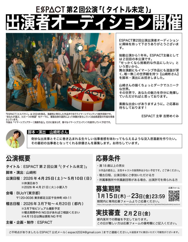 【1/23(金)締切】ESPACT第2回公演 出演者オーディション開催!《脚本・演出 山崎彬》