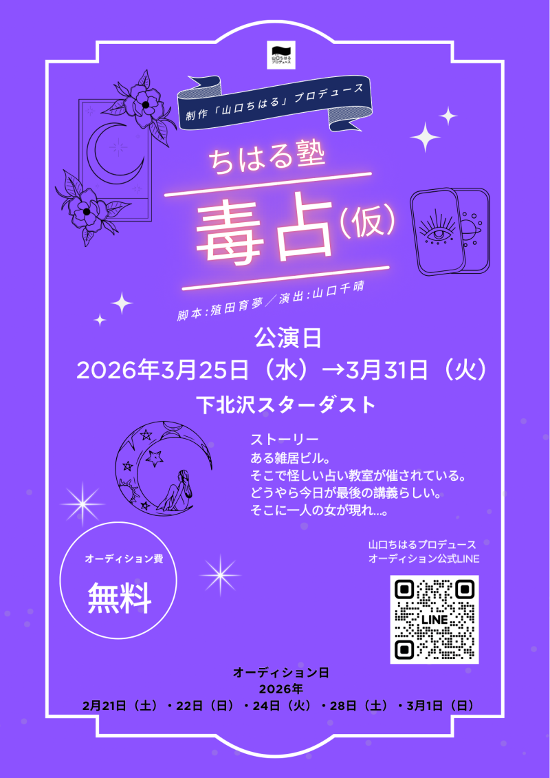 【2026年3月公演】制作「山口ちはる」プロデュース〜ちはる塾〜新作公演『毒占(仮)』(脚本:殖田育夢/演出:山口千晴)出演者オーディション開催!!