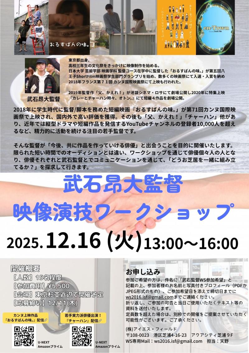この度、武石監督による映像演技ワークショップの開催が決定いたしました。詳しくは下記をご参照ください。