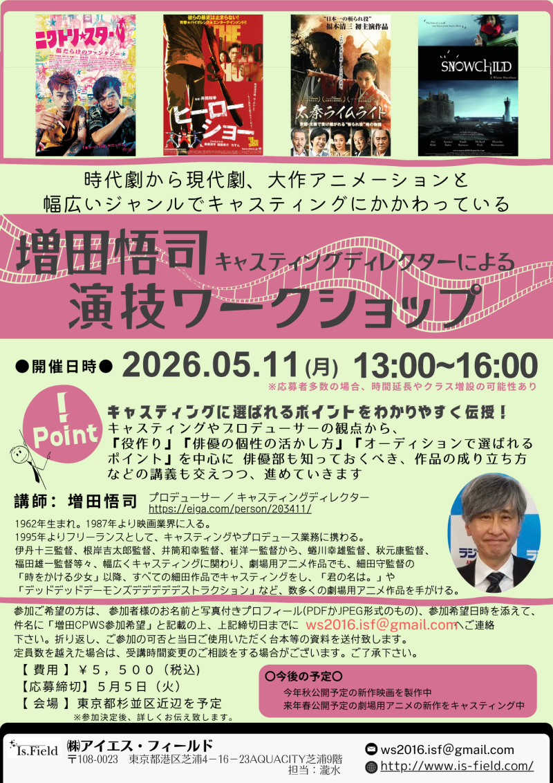 【5月5日締切!】増田悟司氏 映像演技ワークショップ開催