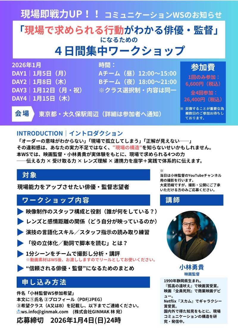「現場で求められる監督・俳優力」を身につける実践WS 《講師:小林勇貴》1月開催【どれか1日でもOK】