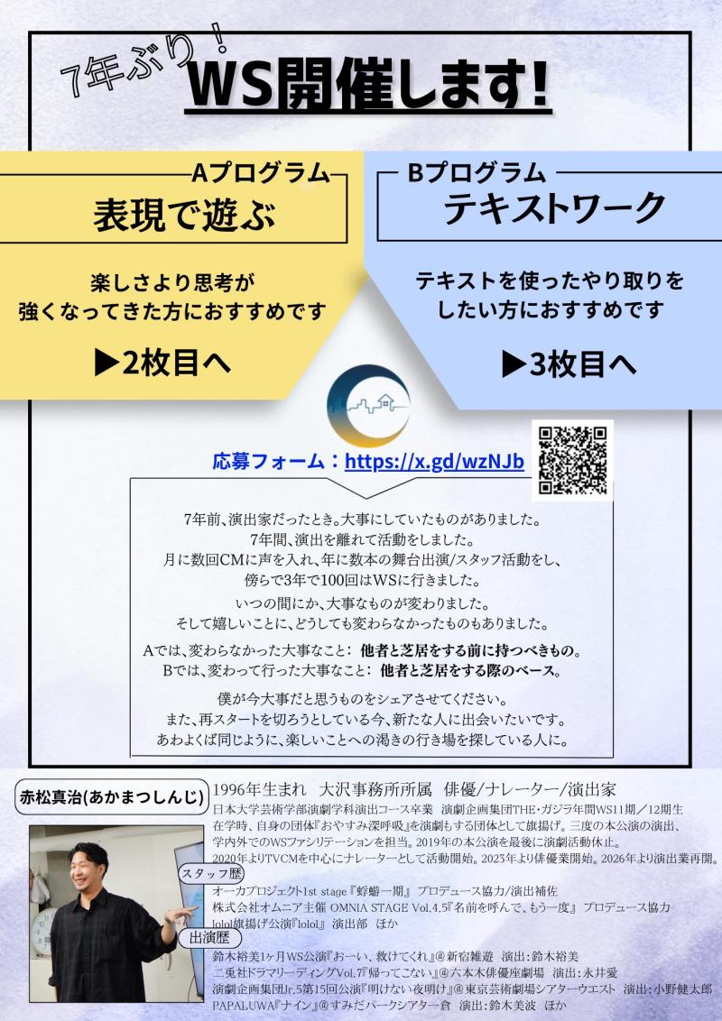俳優・ナレーター・演出家の赤松真治と申します。この度7年ぶりにワークショップを行います。