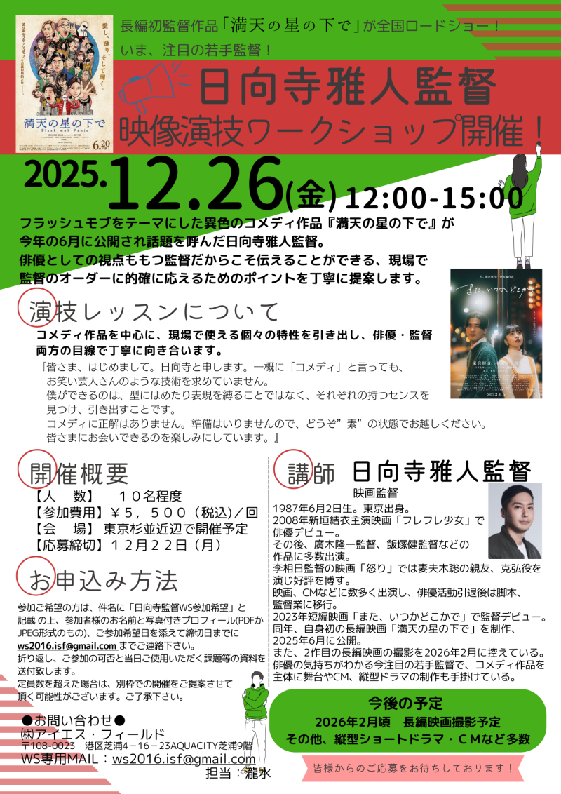 『日向寺雅人監督 映像演技ワークショップ開催のご案内』