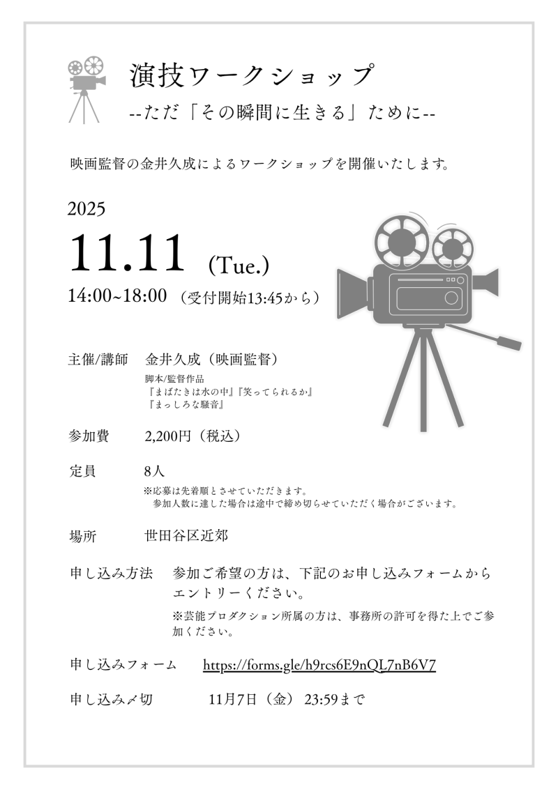 【11月11日開催】【参加者募集】金井久成監督による演技ワークショップ-ただ「その瞬間に生きる」ために-