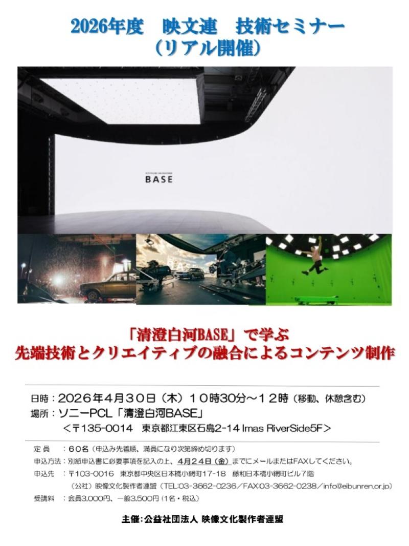 2026年度 映文連 技術セミナー「『清澄白河BASE』で学ぶ先端技術とクリエイティブの融合によるコンテンツ制作」開催のご案内(申込締切 2026年4月24日(金))