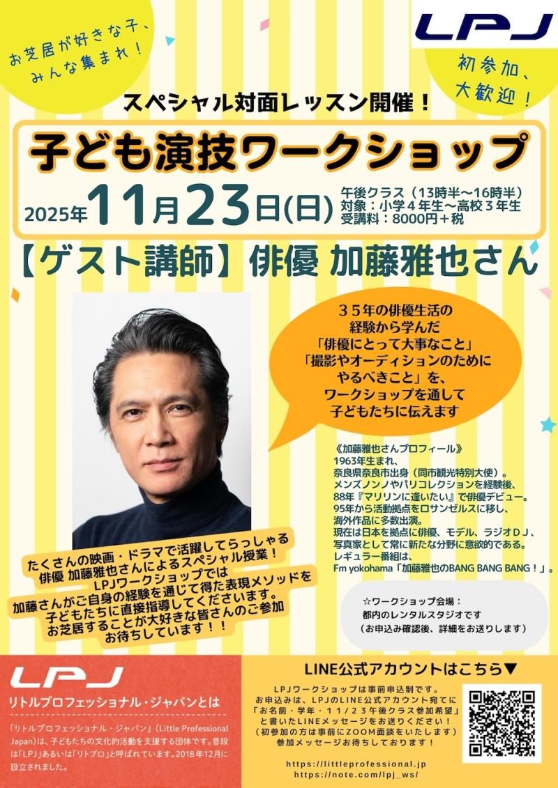 【2025年11月23日(日)13時半〜16時半】俳優・加藤雅也さんから直接学ぶ!LPJ演技ワークショップ開催!(対象:小学4年以上〜中・高校生)