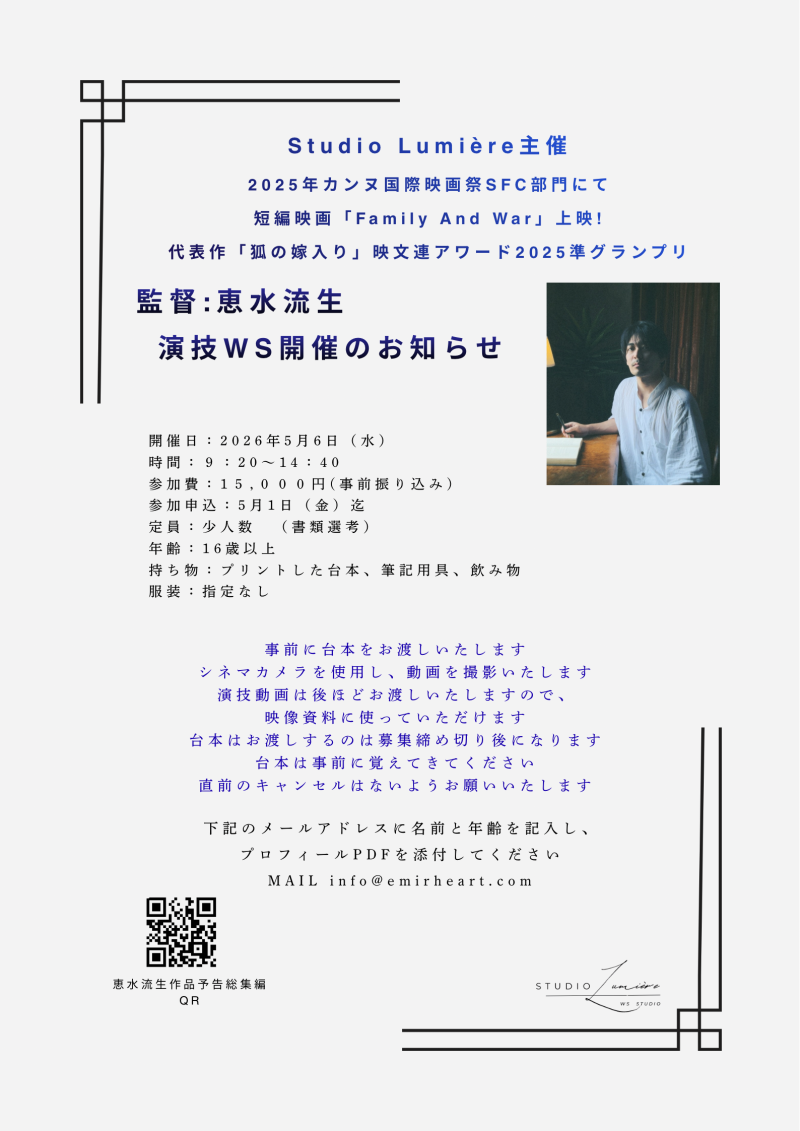2025年カンヌ国際映画祭SFC部門にて 短編映画「Family and War」上映! 代表作「狐の嫁入り」2025年映文連アワード準グランプリ受賞 監督恵水流生WS開催決定!
