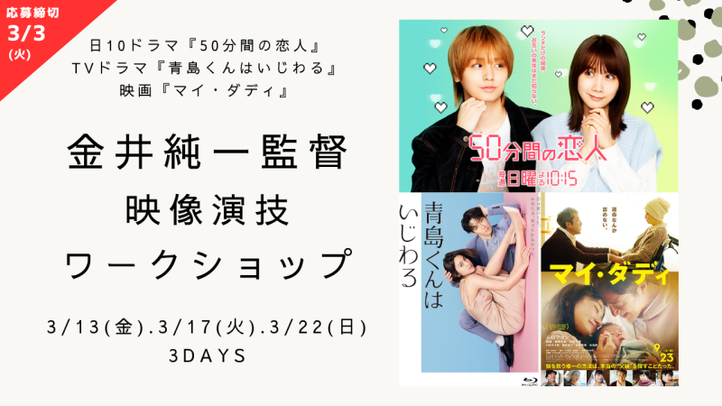 【※参加資格・応募締切が変更になりました※】日10ドラマ『50分間の恋人』、TVドラマ『青島くんはいじわる』、映画『マイ・ダディ』の金井純一監督による映像演技ワークショップ開催!(3/13、3/17、3/22)