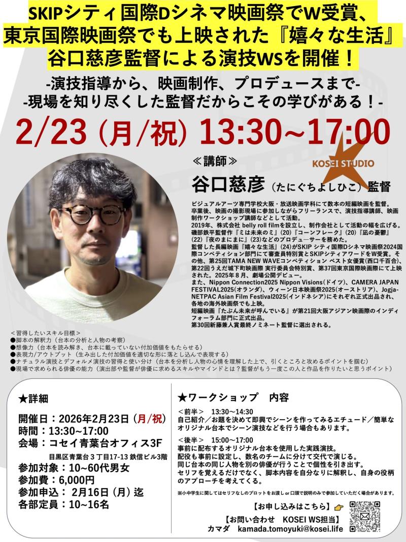 CINEMA PLANNERS > スクール / ワークショップ > 【kosei studio】2/23 谷口慈彦監督 演技WS