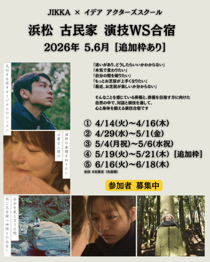 【4,5,6月開催】参加者満足度100%超え!仲間との出会いと、自分自身の新たな気づきで俳優人生のターニングポイントを作る「JIKKAの古民家 演技合宿」 参加者募集中!