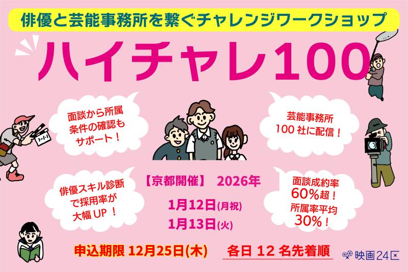 映画、ドラマの企画・制作や俳優の育成・キャスティングを手がける「映画24区」は、2009年に全国の【俳優の原石】や【フリーランスの俳優】と芸能事務所を繋ぐ目的としてスタートさせたワークショプ「映画俳優チャレンジワークショップ(愛称:ハイチャレ100)」を京都で開催します。