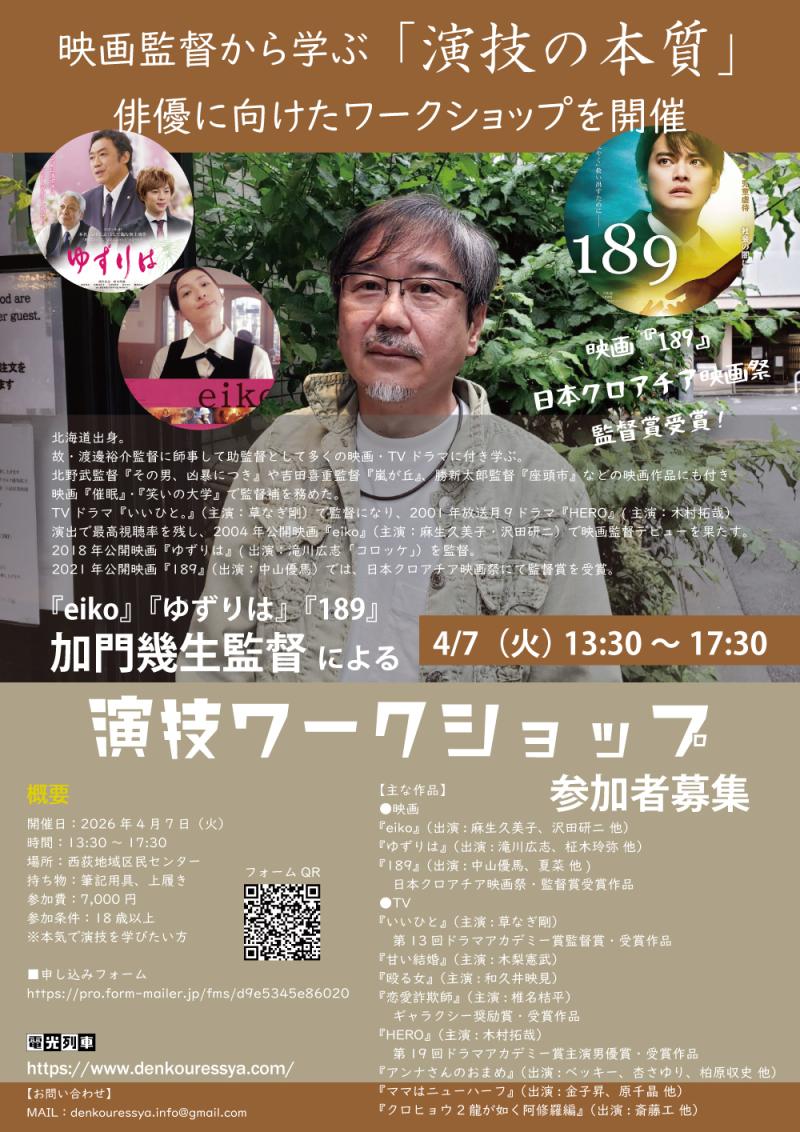 【3月に引き続き開催決定!】俳優に向けたワークショップ 監督の視点に触れる1日 映画『189』『ゆずりは』など、加門幾生監督による演技ワークショップ