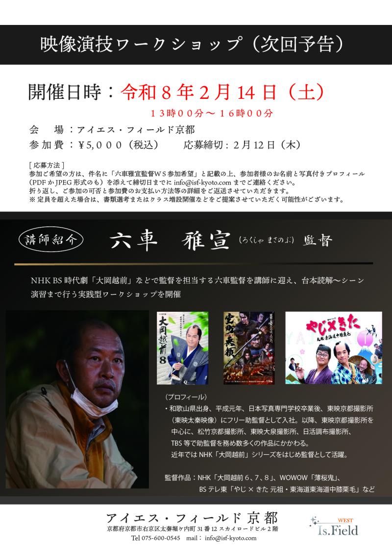 応募方法:件名「六車雅宣監督WS 参加希望」とし、①お名前 ②写真付きプロフィール(PDF またはJPEG)を添えて、info@isf-kyoto.com までメールでお送りください。折り返し、参加可否とお支払い方法等をご連絡します。