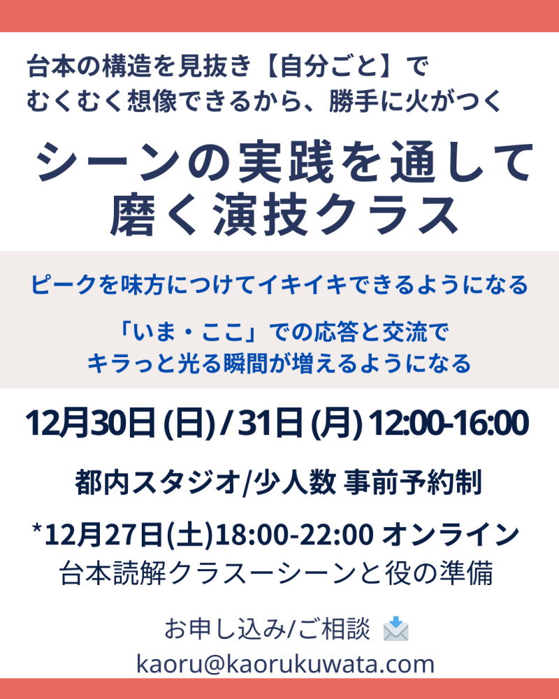 現場で結果を変えたい俳優のための年末集中クラス 12/27オンライン台本読解 × 少人数シーン実践(12/28–31)