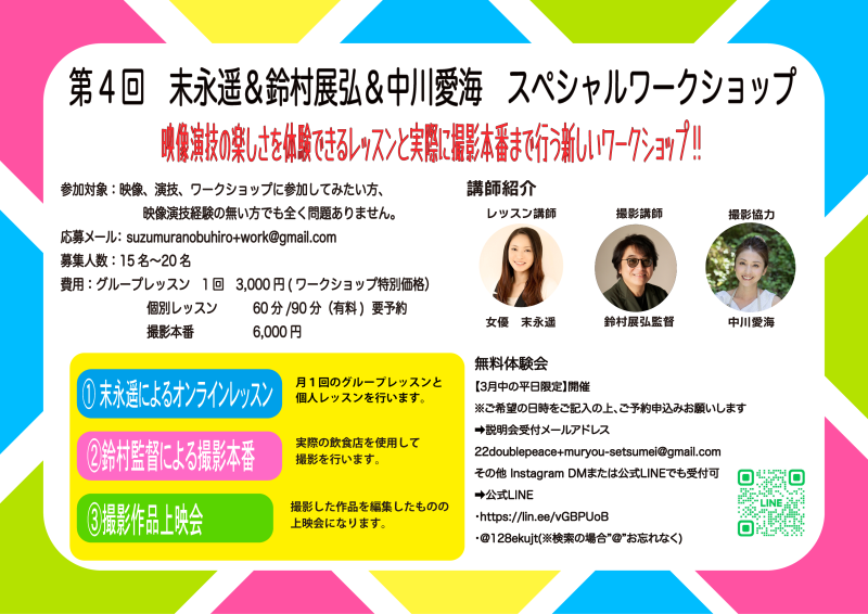 映像の良さや素晴らしさを肌で感じ知っていただくレッスンと映像演技の実践形式のトリプルコラボSPワークショップとなります。