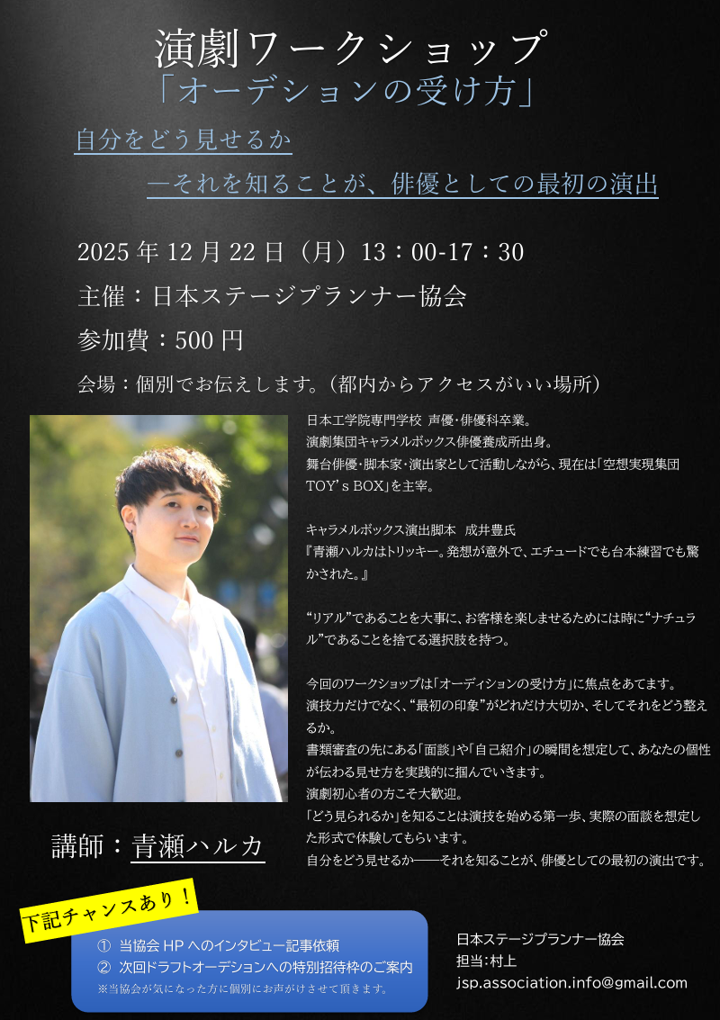 今回はテーマを 「自分の見せ方」「オーディションの受け方」 に焦点を当てて開催します。