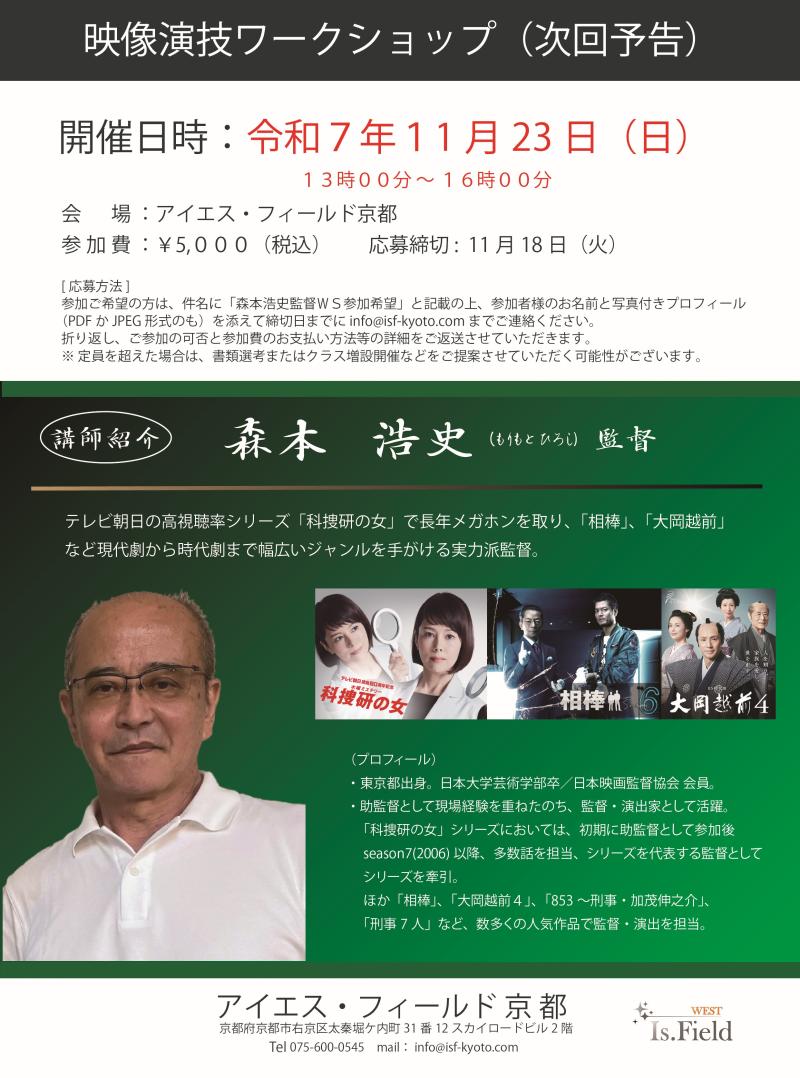 応募方法:件名「森本監督WS 参加希望」とし、①お名前 ②写真付きプロフィール(PDF またはJPEG)を添えて、info@isf-kyoto.com までメールでお送りください。折り返し、参加可否とお支払い方法等をご連絡します。