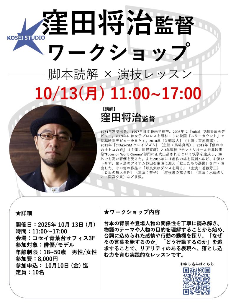 10/10(月)11:00〜17:00 窪田将治監督の演技ワークショップを開催!