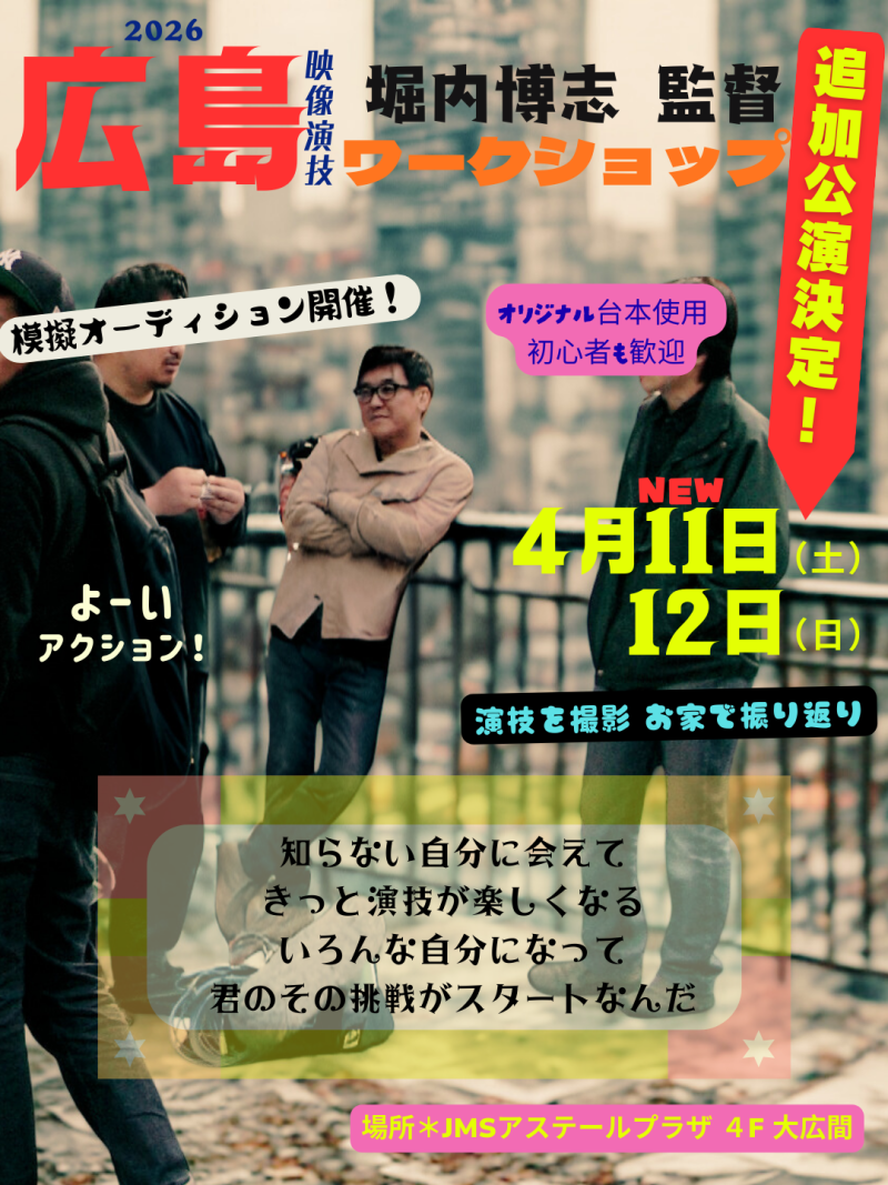 4/11 土曜日 【追加開催決定!】堀内博志 映像演技ワークショップ in 広島