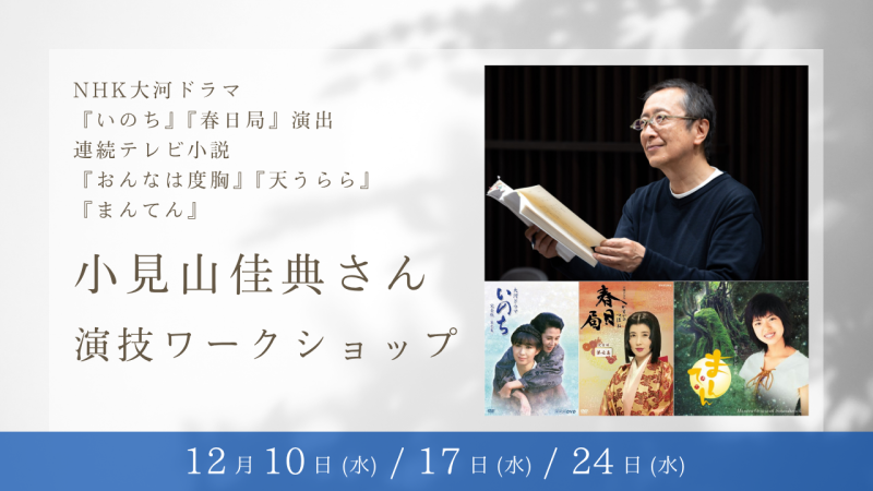 NHK大河ドラマ『いのち』『春日局』の演出、連続テレビ小説『おんなは度胸』『天うらら』『まんてん』などを手掛けた小見山佳典さんによる演技ワークショップ開催!(12/10、12/17、12/24)