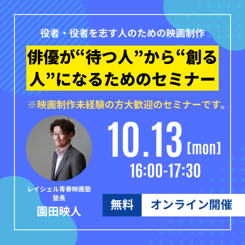 タイトル:【もう待つのはやめよう!】レイシェル青春映画塾:俳優のための映画創作セミナー“自分のやりたい芝居”を映像で実現する方法