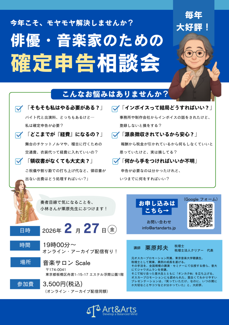 合同会社Art&Arts(本社:東京都、代表:山﨑聡一郎)は、2026年2月27日(金)、税理士の栗原邦夫氏を講師に迎え、アーティスト・演奏家を対象とした確定申告講座を開催いたします。
