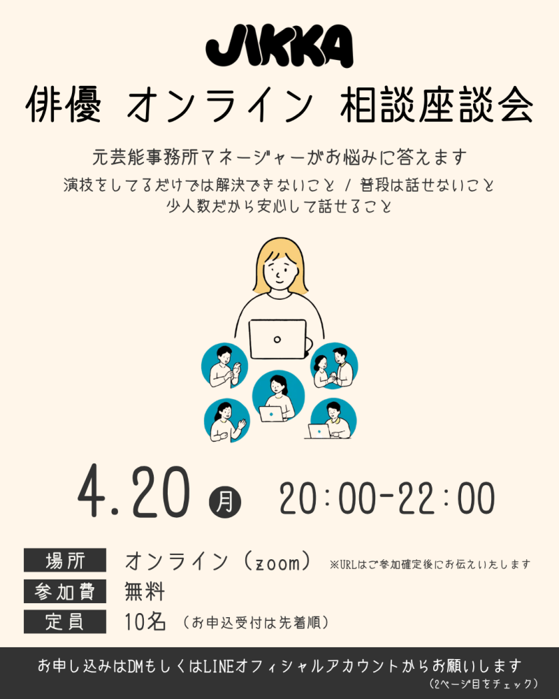 【4月 『俳優 無料オンライン相談座談会』実施します】普段なかなか話す機会がない悩みごとや相談事を、集まった俳優の皆で共有しませんか?参加者募集中!