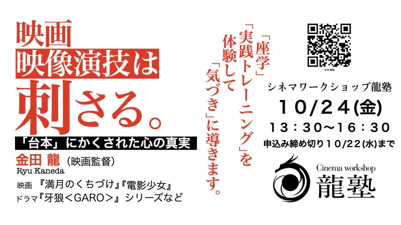 まもなく!!【10/24(金)】映画・映像演技は「刺さる。」/『電影少女』『牙狼<GARO>』シリーズなどの監督 金田 龍が映像演技ワークショップを実施します!