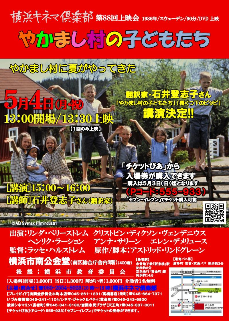 横浜キネマ倶楽部 第88回上映会『やかまし村の子どもたち』5月4日(月祝) 横浜市南公会堂