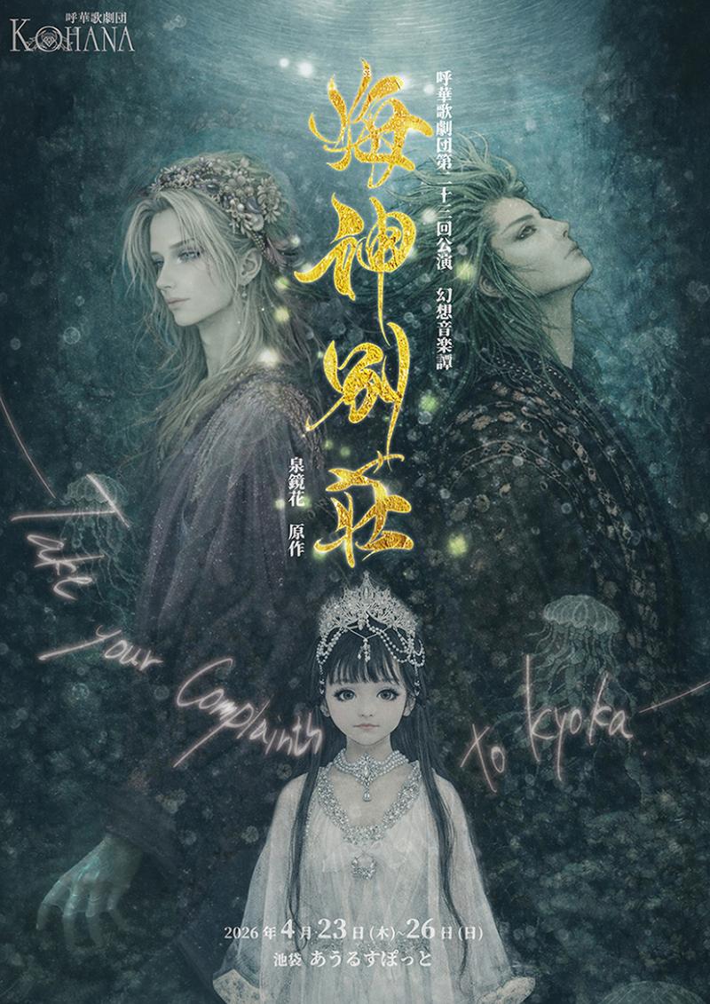 明治大正に活躍した耽美作家・泉鏡花原作の戯曲『海神別荘』を歌と踊りの歌劇として仕立てた新作公演。全編オリジナル曲で紡がれる幻想的な音楽劇。 陸に住まう乙女は海の財宝と引き換えに、生贄として波に沈められた。 目をさますと、そこは海の公子の住まう宮殿であった。