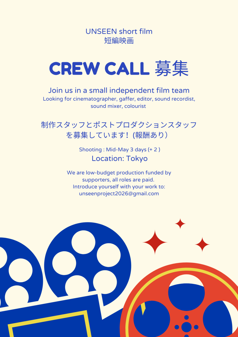 短編映画『UNSEEN』(制作準備中)では、東京での撮影に向けて制作に参加いただけるクルーを募集しています。日本語と英語の両方でコミュニケーションが可能な方を歓迎します。
